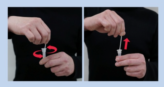 콧속에서 꺼낸 면봉은 검체추출액 통에 넣어 10회 이상 저어줘야 합니다. 면봉을 검체추출액통(튜브)으로 쥐어짜 내면서 꺼내야 합니다. 제품에 따라 면봉을 부러뜨려 검체추출액통(튜브)에 넣기도 하니 자신이 사용한 제품은 어떻게 사용하는 것인지 정확히 파악해야 하니 꼼꼼히 살펴보셔야 합니다.