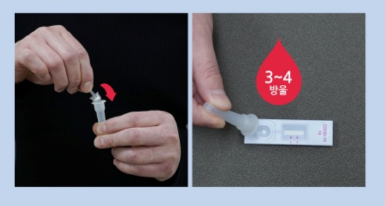 그리고 난 다음 검체추출액통 입구에 마개(필터마개, 노즐캡, 필터캡 등)를 닫고, 테스트기에 검체추출액통을 눌러 3~4방울 떨어뜨리면 됩니다.