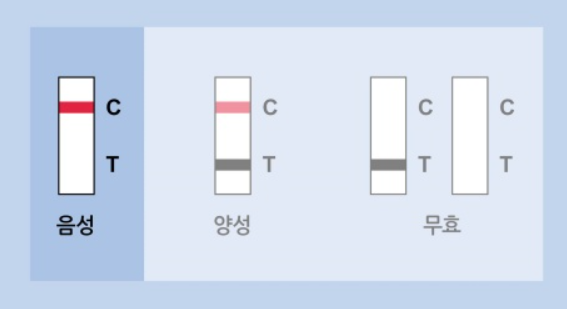 검사 결과는 약 15분이 지나고 나서 확인할 수 있습니다. 검사결과가 대조선(C) 한 줄이면 음성을 의미하게 됩니다. 시험선(T)과 대조선(C)이 두 줄로 나타나면 양성인 결과입니다. 시험선(T)과 관계없이 대조선(C)이 나타나지 않으면, 무효이므로 새로운 키트로 재검사가 필요한 상황이니 참고하시길 바랍니다.