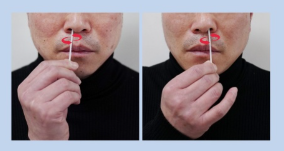 검체추출액통을 꺼내서 덮개를 제거하면, 우선 상자 또는 플라스틱 틀에 통을 꽂아야 합니다. 검체통을 고정하고 나서 검체 채취를 시작하면 됩니다. 동봉된 면봉을 뜯고, 양쪽 콧구멍 1.5~2cm 깊이에 같은 면봉으로 콧속 벽에 닿은 채 각각 10회 원을 그리며 문질러주면 됩니더. 이때 주의하실 점이 면봉의 솜 부분에 손이 닿지 않도록 주의해야만 합니다.