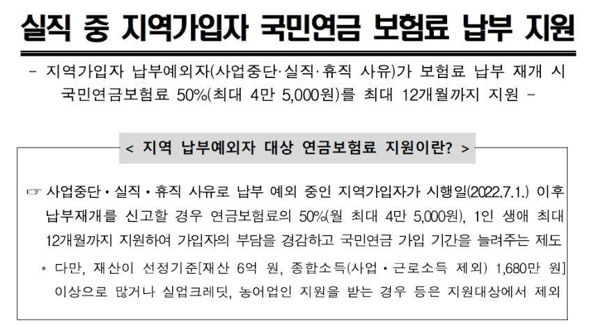 실직이나 사업 중단으로 인해 국민연금 납부예외자가 납부를 재개하면 12개월까지 한 사람당 월 최대 45, 000원까지 지원하는 제도입니다.